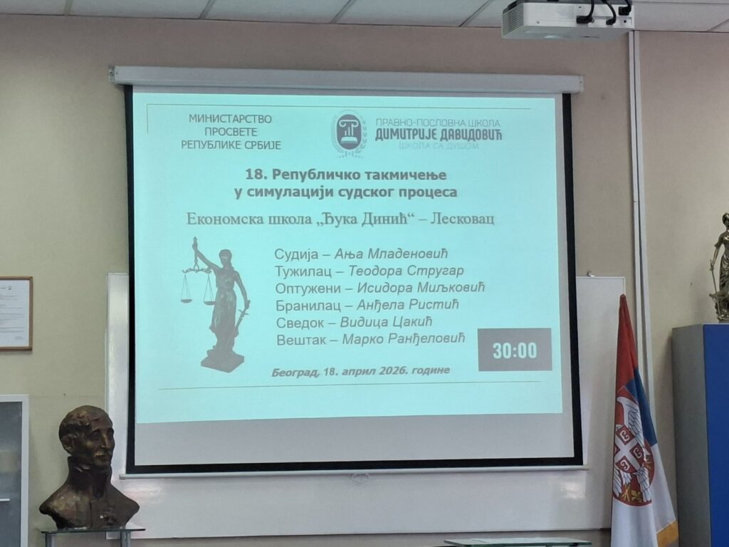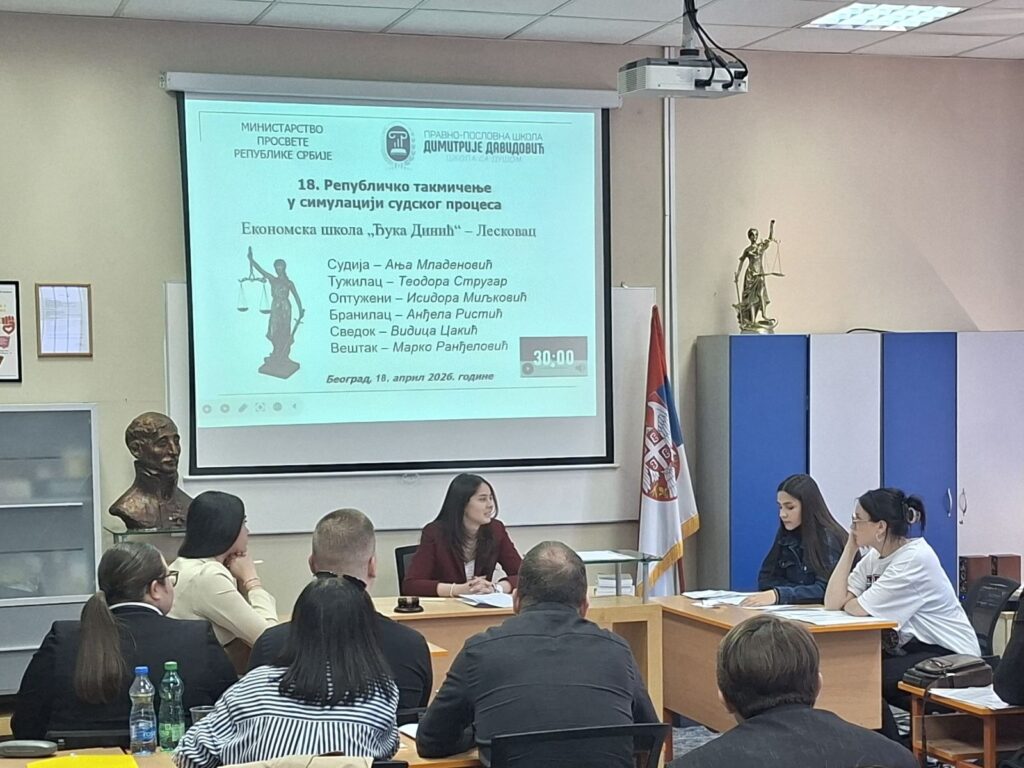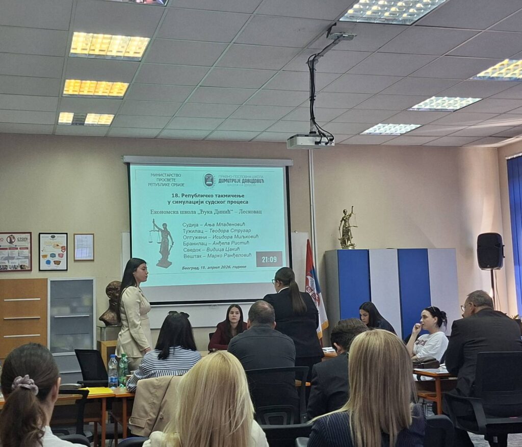 Ученици наше школе остварили су запажен успех на Републичком такмичењу средњих школа у симулацији судског процеса одржаном 18. aприла 2026. године у Средњој правно-пословној школи „Димитрије Давидовић“ у Земуну. У јакој конкуренцији 11 школа наш тим је показао висок ниво знања, вештина и тимског рада.